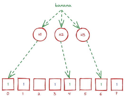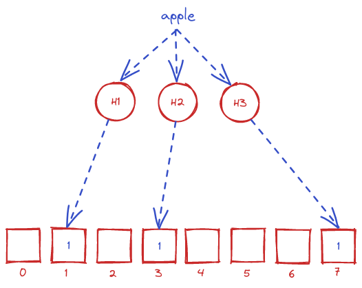 Ta cùng xét ví dụ về bloom filter với %k=3% và %m=8% như bên dưới. Giả sử ta insert một bản ghi dữ liệu với key "apple" vào cơ sở dữ liệu, thì trước tiên "apple" sẽ được đi qua 3 hash function H1, H2, H3. Mỗi hash function sẽ cho ra kết quả là một số trong đoạn %[0..m-1]%, ta thực hiện bật bit ở vị trí tương ứng trong mảng nhị phân thành 1. Như trong hình, sau khi đi qua 3 hàm hash, ta được chuỗi vị trí được bật bit đó là [1, 3, 7].