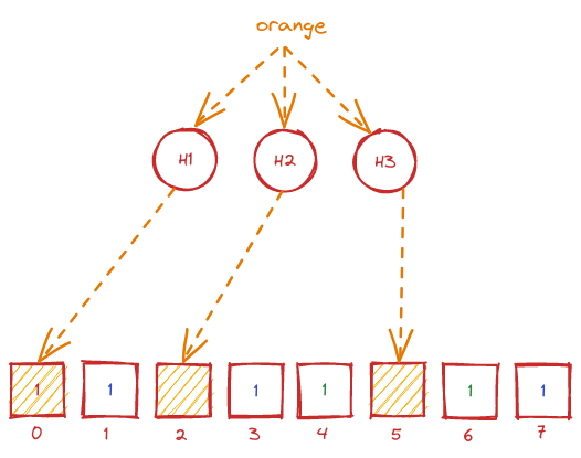 Sau khi đã insert 2 key "apple" và "banana" vào cơ sở dữ liệu, bây giờ chúng ta sẽ có một truy vấn mới đó là xác định xem key "orange" có tồn tại trong cơ sở dữ liệu hay không. Cũng tương tự như truy vấn insert, "orange" cũng được cho qua 3 hàm hash H1, H2, H3. Nhưng lần này thay vì bật bit thì chúng ta sẽ kiểm tra xem bit tại vị trí của giá trị hàm hash đã bật hay chưa. Nếu có bất kỳ một bit nào bằng 0 tức là chắc chắn "orange" không tồn tại trong cơ sở dữ liệu. Ngược lại nếu tất cả các bit bằng 1 thì ta có thể kết luận rằng "orange có khả năng nằm trong cơ sở dữ liệu". Bởi vì một chuỗi các bit 1 có thể là kết quả hàm hash của rất nhiều key khác nhau, do đó ta không thể chắc chắn trong trường hợp này. Đó cũng là lí do bloom filter được gọi là cấu trúc dữ liệu dựa trên xác suất.