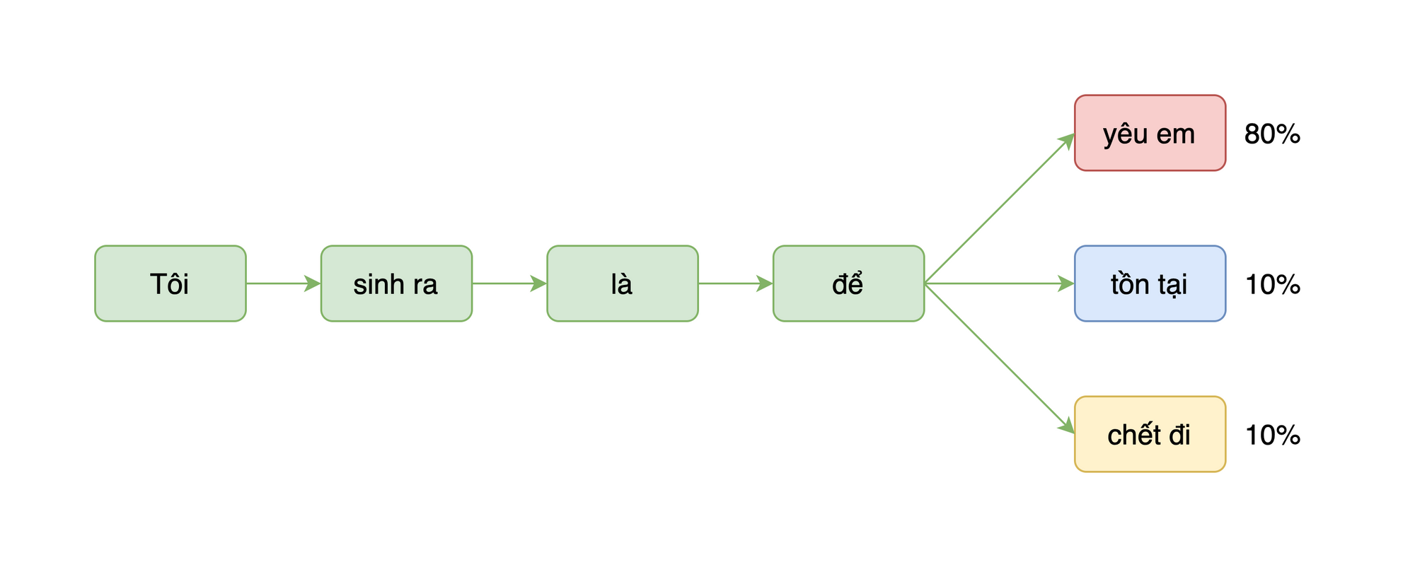Ví dụ, ta có một đoạn văn bản "Tôi sinh ra là để" thì mô hình ngôn ngữ sẽ giúp chúng ta tính được xác suất của từ tiếp theo trong câu như bên dưới.