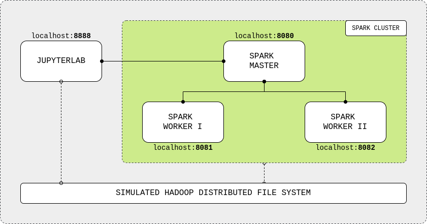 First, take a look at the figure below, this show how Spark cluster is organized and how to link spark cluster with jupyterlab. We need to build all of these things on top of a simulated HDFS system, so we can create a docker-compose file for the whole system and build this without any complicated installation stuff.