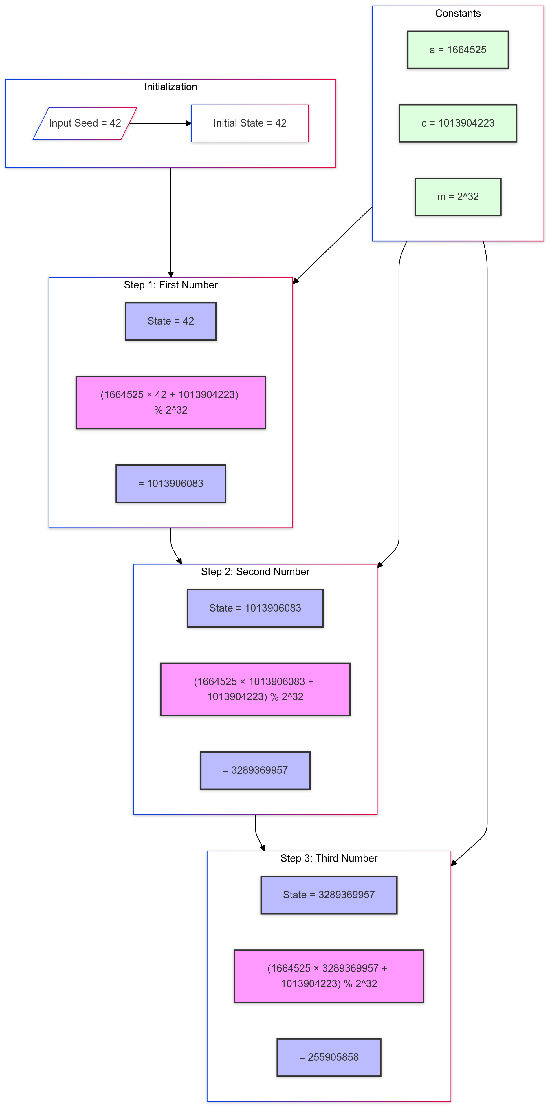 A Pseudorandom Number Generator (PRNG) is basically an algorithm that takes an initial value, called a seed, and produces a sequence of numbers that mimic true randomness. Let's check out a simple example called the Linear Congruential Generator (LCG):