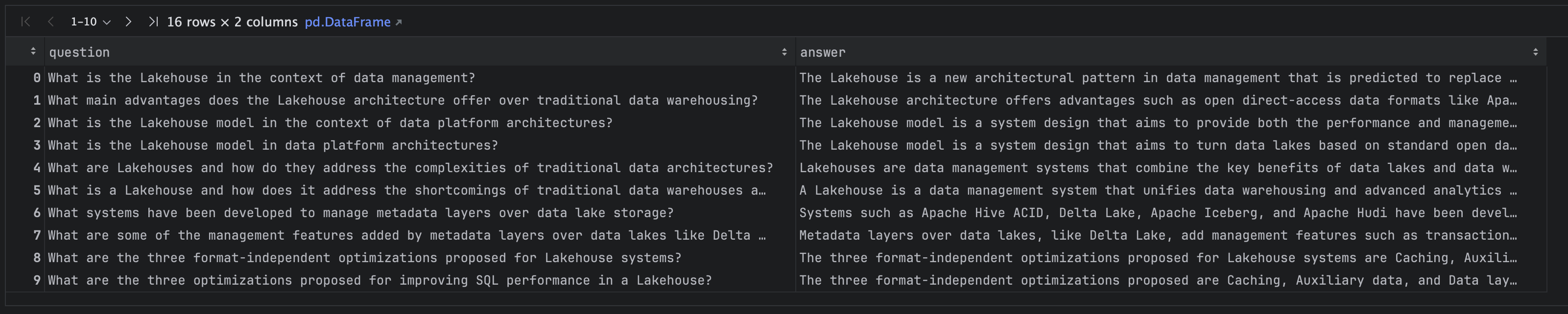After running the code mentioned above, we obtain a CSV file as the result. This file contains pairs of questions and answers pertaining to the document we input, as follows: