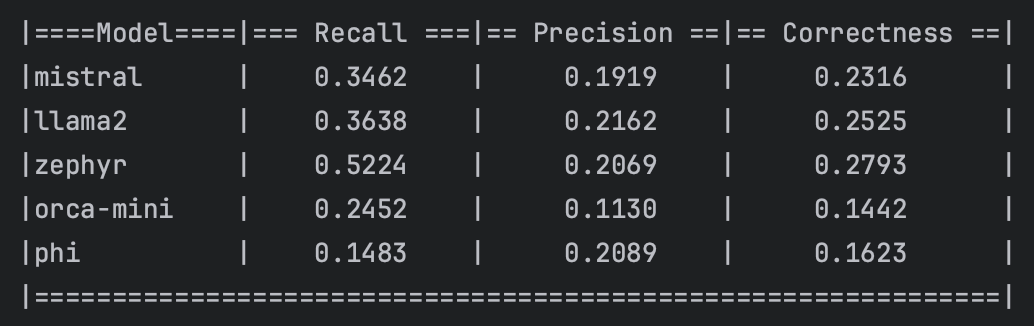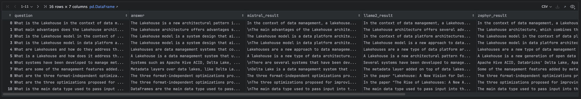 In summary, the code above establishes a simple document retrieval chain. We execute this chain using several models, such as Mistral, Llama2, Zephyr, Orca-mini, and Phi. As a result, we add five additional columns to our existing DataFrame to store the prediction results of each LLM model.