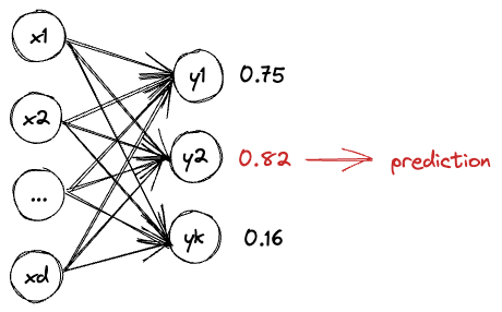 Còn nhãn dự đoán %y \in (0, 1)^k% cho điểm dữ liệu %x% thì được thể hiện như sau: