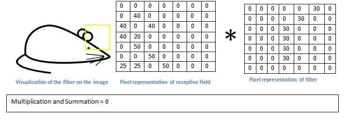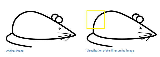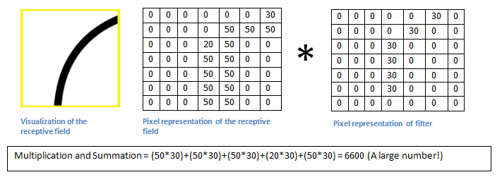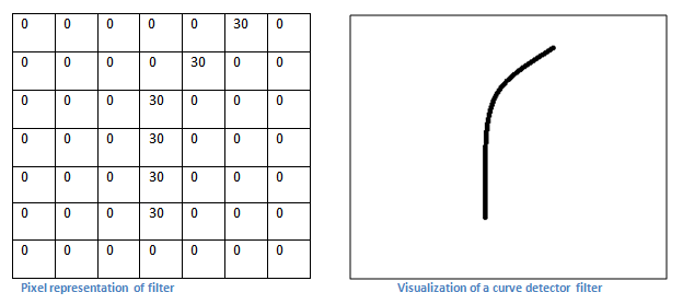 Kết quả nhận được là một ma trận %3×3% ở đầu ra. Ma trận này được gọi là Convolved Feature hay Feature Map. Phép tính tích chập trong trường hợp này là tổng element wise giữa hai ma trận cùng kích thước (tổng của tích các ô tương ứng). Vậy câu hỏi đặc ra là làm sao để filter có thế phát hiện được đặt trưng của một tấm ảnh (Feature detection)? Để giải thích điều này ta cũng hay hình dung filter là một tấm ảnh mô tả đặc trưng, ví dụ dưới đây là một filter mô tả đường cong: