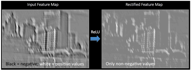 Non linearity hay khử tuyến tính là một vấn đề cần thiết đối với CNN. Đây là một activation layer đi theo sau Convolution layer để lọc các giá trị trong feature map. Có rất nhiều hàm activation có tác dụng làm khử tuyến tính như là sigmoid hay tanh. Tuy nhiên, hàm ReLU (Rectified Linear Unit) được dùng phổ biến nhất đối với CNN vì nó giúp train model nhanh hơn những hàm còn lại và tránh được trường hợp (Vanishing Gradient Problem). Hàm ReLU sẽ fix tất cả những giá trị âm ở Feature Map thành 00 do nó có dạng %f(x)=\text{max}(0,x)%.