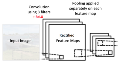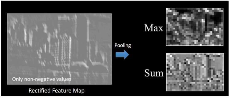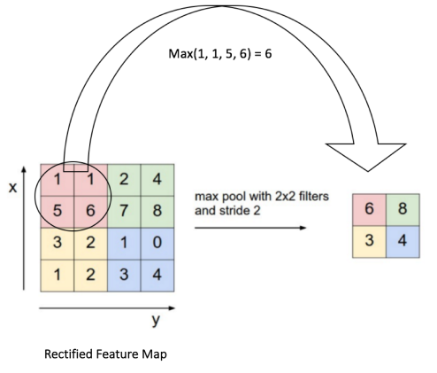 Ngay sau ReLU layer sẽ là pooling layer hay còn gọi là subsamling hay downsampling layer. Mục tiêu của bước này là làm giảm kích thước của tấm ảnh và chỉ giữ lại những thông tin quan trọng giúp kiểm soát overfitting. Những cách cài đặt pooling layer phổ biến là max pooling, sum pooling và avg pooling. Ví dụ, với max pooling layer dưới đây, ta chia Rectified Feature Map thành những ma trân %2×2% và chỉ giữa lại những giá trị lớn nhất trong đó: