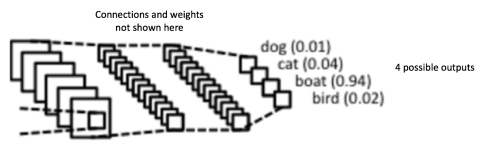 Phía trên là hình ảnh một kiến trúc CNN cơ bản dùng để nhận dạng vật thể trong ảnh. Mạng này lấy ý tưởng từ LeNet kết hợp với một vài cải tiến trong vài năm trở lại đây. Dễ thấy kết quả đầu ra (output) là khá tốt, khi xác suất nhận dạng được có một chiếc tàu (boat) trong ảnh là 0.94. Trong khi với 3 sự lựa chọn còn lại (dog, cat, bird) thì có xác suất khá nhỏ. Điều này đã mô tả đúng ảnh đầu vào (input).
