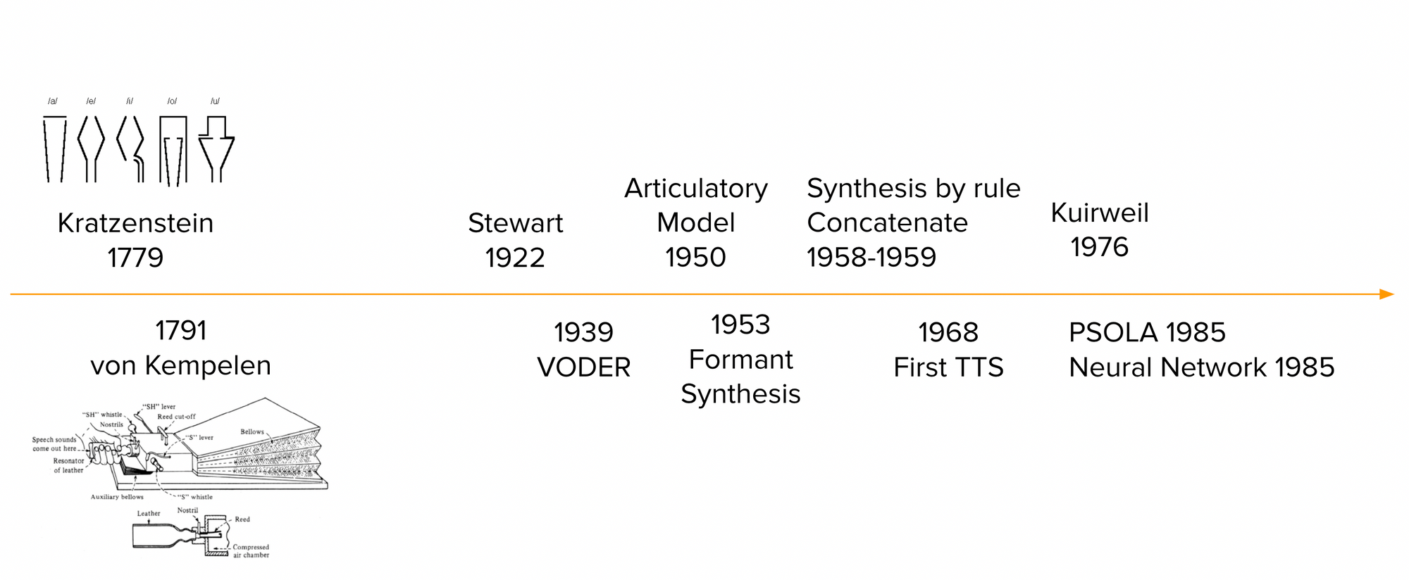 Trở lại thế kỉ XVIII, giáo sư Christian Kratzenstein (1723-1795) được ghi nhận là người đầu tiên đưa ra một phương pháp tổng hợp tiếng nói cơ học. Vào năm 1779, ông đã mô tả sự khác biệt khi phát âm các nguyên âm (/u/, /e/, /o/, /a/, /i/) và tạo ra một bộ cộng hưởng âm thanh tương tự như các nhạc cụ với cơ chế rung cho phép tạo ra các âm thanh tương tự như các nguyên âm trên. Không lâu sau, Wolfgang von Kempelen - một nhà khoa học tại Vienna cũng giới thiệu hệ thống mô phỏng tiếng nói đầu tiên của mình với tên gọi Acoustic - Mechanical Speech Machine, AMSM cho phép mô phỏng một số từ đơn và từ ghép không phức tạp. Sau đó cũng có một số nỗ lực cải thiện và nâng cấp AMSM từ nhiều nhà khoa học khác. Về cơ bản, những hệ thống kể trên đều là những hệ thống cơ học. Hệ thống mô phỏng tiếng nói điện tử đầu tiên được phát minh bởi Bell Labs và Home Dubley khi họ đã trình làng hệ thống VODER tại triển lãm New York World's Fair vào năm 1939. Hệ thống tổng hợp tiếng nói bằng máy tính hiện đại đầu tiên cũng được phát triển bởi Bell Labs từ những năm 1950 và hoàn thành vào năm 1968. Năm 1961, giáo sư John Larry Kelly, Jr sử dụng máy tính IBM 704 để chạy chương trình mô phỏng tiếng nói đầu tiên trên máy tính. Đây là một bước ngoặc quan trọng của không chỉ riêng Bell Labs mà là của cả quá trình phát triển của bài toán tổng hợp tiếng nói.