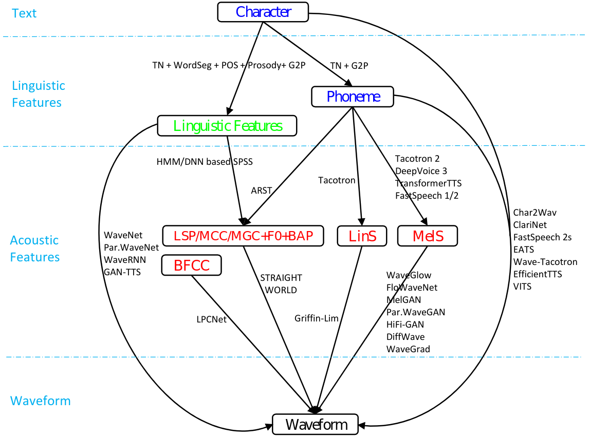 Các thuật toán Neural Speech Synthesis thường chia làm hai trường phái chính. Thứ nhất đó là giữ nguyên cấu trúc 3 thành phần như các phương pháp statistical parameteric synthesis và thay một vài hoặc toàn bộ các thành phần bằng mạng neuron nhân tạo (neural network). Các mô hình dạng này có thể kể đến như WaveNet [c3], DeepVoice 1-2 [c4]. Trường phái thứ hai là xây dựng mô hình end-to-end (từ đầu đến cuối), các mô hình này tổng hợp âm thanh trực tiếp từ văn bản đầu vào như ClariNet [c5], FastSpeech 2 [c6], EATS [c7]. Ngoài ra một số mô hình như DeepVoice 3 [c8], FastSpeech [c9], Tacotron [c10] là các mô hình end-to-end không hoàn chỉnh. Bởi vì các mô hình này tuy vẫn giữ đủ 3 thành phần nhưng các module như xử lý ngôn ngữ tự nhiên thường được thiết kế đơn giản nhất có thể, và sử dụng mel-spectrogram làm đặc trưng âm thanh chứ không sử dụng một hàm tham số (parametric function) nào cả.