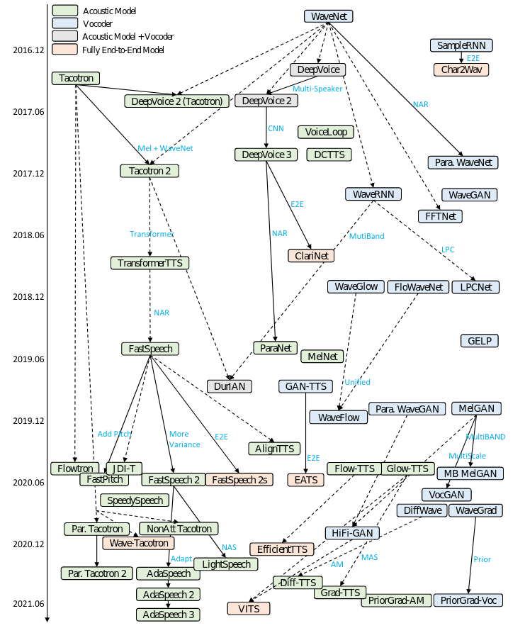 - Các mô hình khác: Ngoài những mô hình đã kể trên, nhiều nghiên cứu khác cũng áp dụng các mô hình như GAN và VAE: Parallel WaveNet [c17], WaveGlow [c18], FloWaveNet [c19], Flowtron [c20], FlowTTS [c21], GlowTTS [c22],..