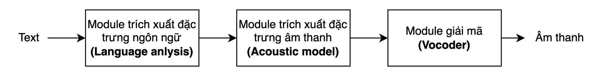 Ở module trích xuất đặc trưng ngôn ngữ, những phương pháp được dùng bao gồm chuẩn hóa (text normalization), tách từ (word segmentation), phân tích cú pháp (syntax analysis),.. Còn đối với mô hình đặc trưng âm thanh thì nổi bật nhất chính là mô hình HMM (Hidden Markov Model). Với module giãi mã (vocoder) thì sẽ bao gồm những thuật toán biến đổi acoustic feature thành âm thanh cuối. Những thuật toán này có mục tiêu là tạo ra tiếng nói tự nhiên, ít nhiễu và cần ít dữ liệu huấn luyện nhất có thể.